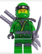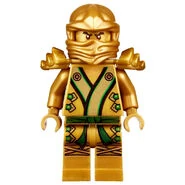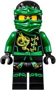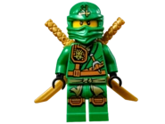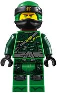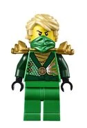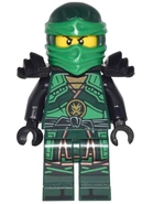 He wears a new type of ninja hood and outfit. Lloyd has a green variant of the Techno Armour combined with his ninja gi. He also has a white double-pauldron that can hold two katana swords. He also has the Ninjago letter 'L' on his forehead, which is the first letter of his name.