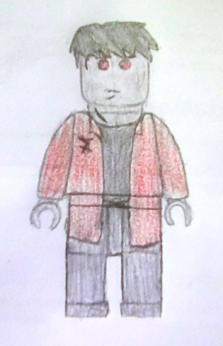 He has spiky black hair, red eyes, and gray skin. He wears a dark red tunic over a black shirt and pants, and carries a large, elaborate blade for a weapon.
